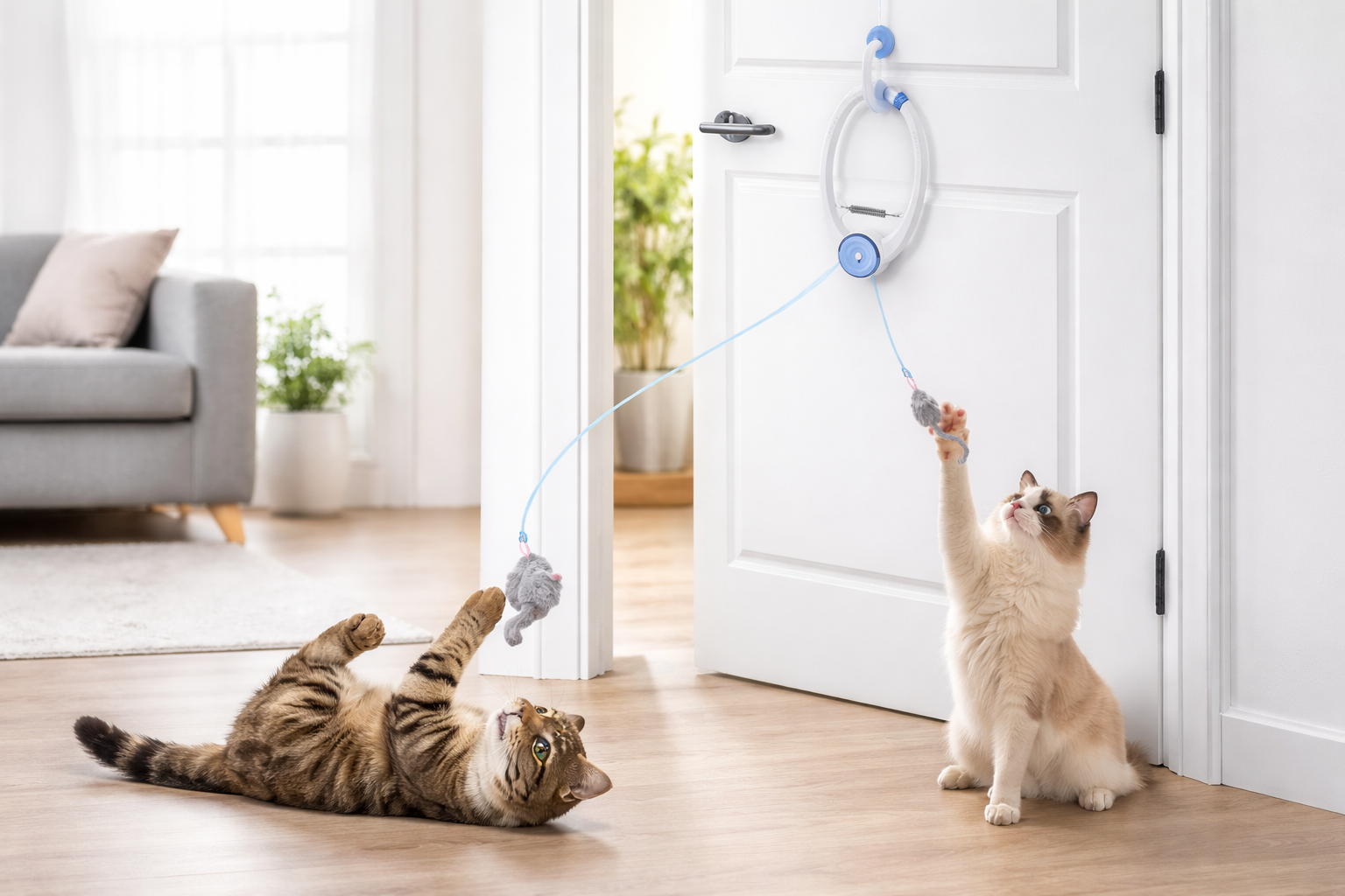 Simply hang the toy over a door (up to 14 cm thick), turn it on, and let the fun begin! The built-in motor randomly raises and lowers the rope to mimic natural prey movement.